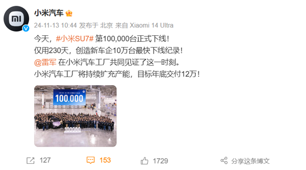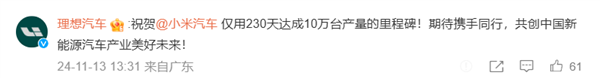 理想汽车:祝贺小米汽车 仅用230天达成10万台产量的里程碑!期待携手同行,共创中国新能源汽车产业美好未来!