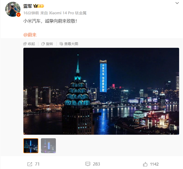 蔚来:恭喜小米汽车第10万台量产车下线,一起为中国汽车加电。