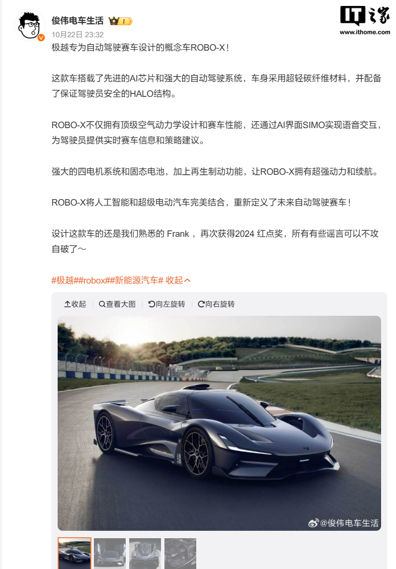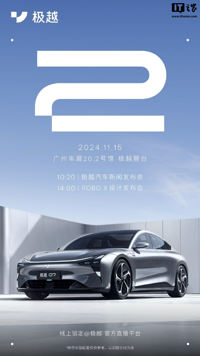 IT之家 11 月 13 日消息,极越汽车今晚宣布,在后天开幕的 2024 广州车展期间将举行新闻发布会和 ROBO X 设计发布会。据悉,ROBO X 是极越“专为自动驾驶赛车设计”的概念车。