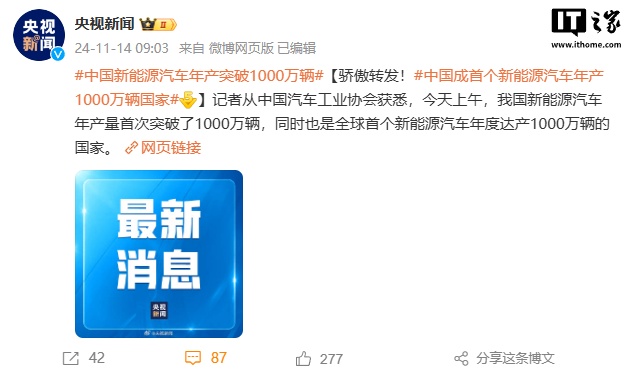 IT之家 11 月 14 日消息,据央视报道,我国新能源汽车年产量今天首次突破了 1000 万辆,同时也是全球首个新能源汽车年度达产 1000 万辆的国家。