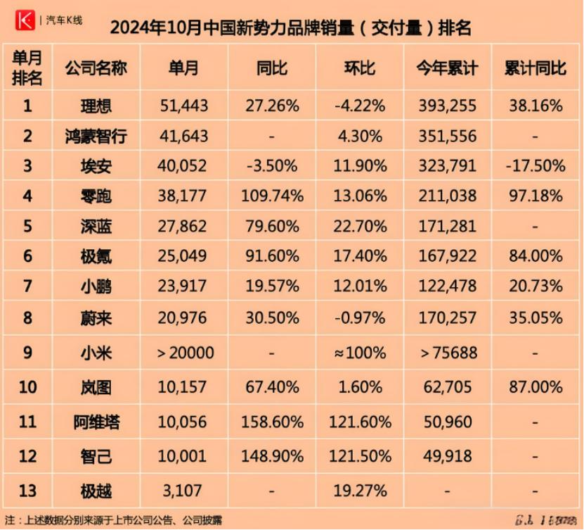 据10月最新数据显示,理想汽车单月新车交付量为51443台,继7月、9月之后再次破五,可以说是新势力中最稳的;鸿蒙智行全系交付新车 41643 辆,但基本是靠问界独撑,智界和享界目前来看,都是扶不起的阿斗。