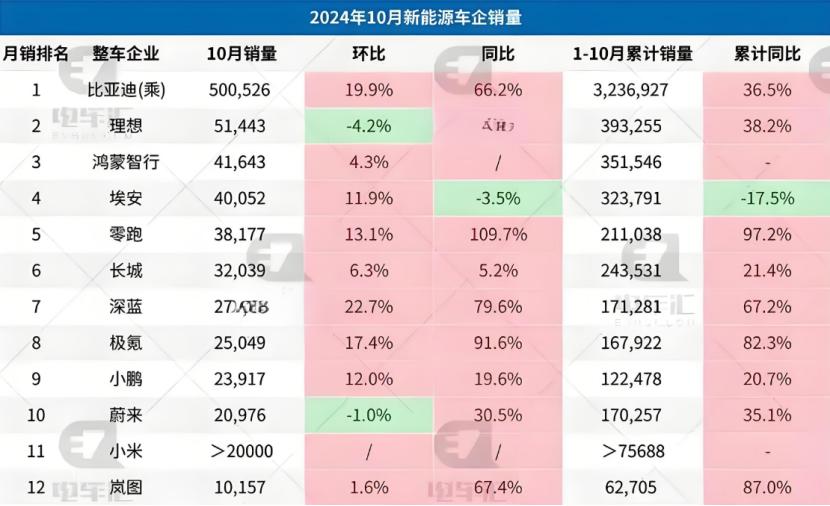 当然,传统车企中也有掉链子的。比如长城欧拉和广汽埃安,欧拉10月份的销量为5560辆,同比下滑48.64%;埃安10月销售新车38152辆,同比下滑8.07%。而这两家也是对新能源车市的“卷”意见最大的,其掌门人都曾出来炮轰。