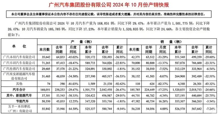 曾经引以为傲的新能源板块,如今成了拖后腿的存在。广汽集团1-10月累计销量同比下滑24.66%,其中埃安1-10月累计销量同比下滑32.51%。