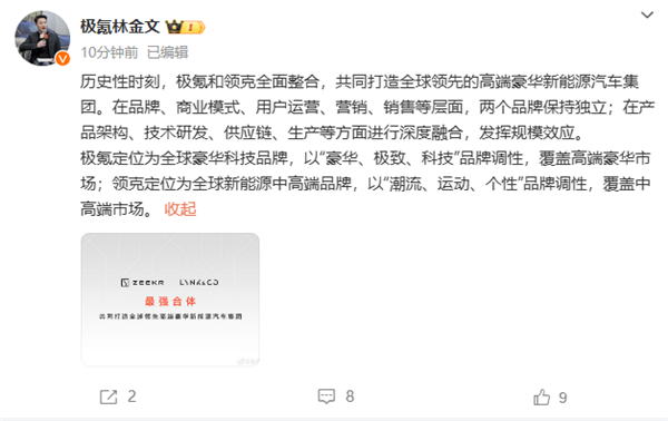 极氪智能科技副总裁林金文发布微博称:极氪和领克全面整合,共同打造全球领先的高端豪华新能源汽车集团。