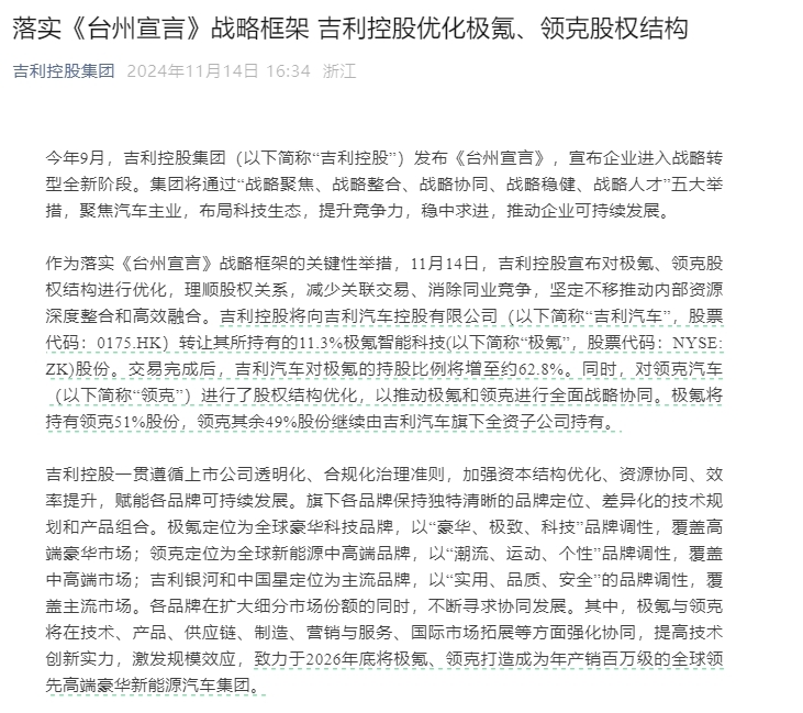 凤凰网科技讯 11月14日,吉利控股集团宣布落实《台州宣言》战略框架。吉利控股优化极氪、领克股权结构,理顺股权关系,减少关联交易、消除同业竞争,坚定不移推动内部资源深度整合和高效融合。