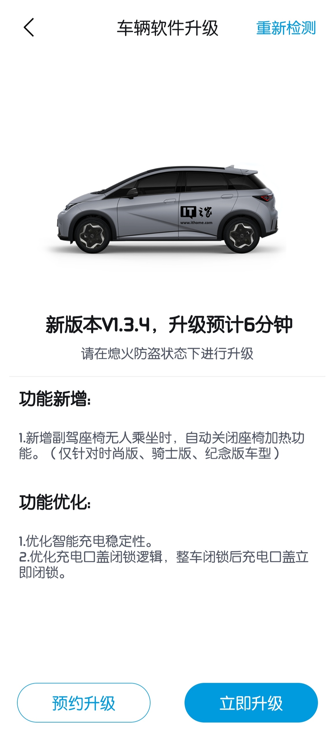 功能新增:1.新增副驾座椅无人乘坐时,自动关闭座椅加热功能。(仅针对时尚版、骑士版、纪念版车型)功能优化:1.优化智能充电稳定性。2.优化充电口盖闭锁逻辑,整车闭锁后充电口盖立即闭锁。