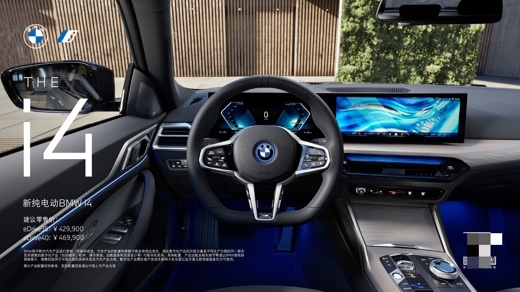 新款宝马 i4 的空调温度 / 风量、座椅及方向盘加热等功能可通过显示屏或语音控制。中控屏下方的空调出风口处增加了氛围灯,车辆还使用了新样式的平底式三辐方向盘和新拼色结构的座椅。