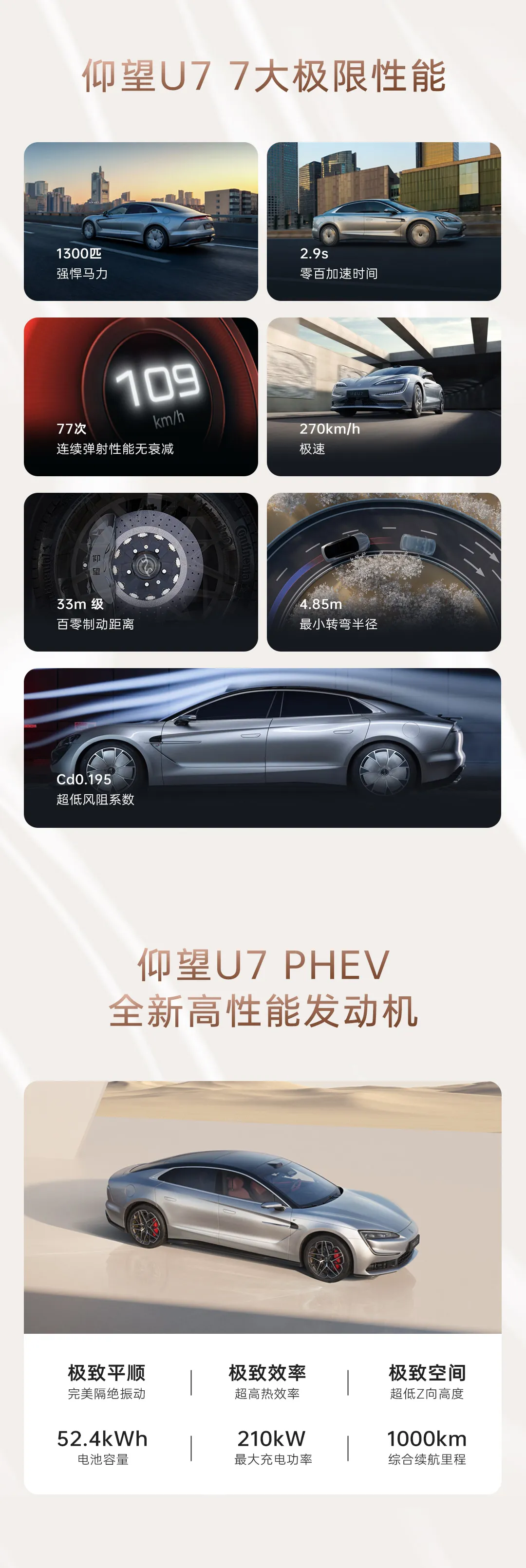 仰望 U7 插混版车型具备 52.4kWh 电池容量,最大充电功率可达 210kW,综合续航里程 1000km。