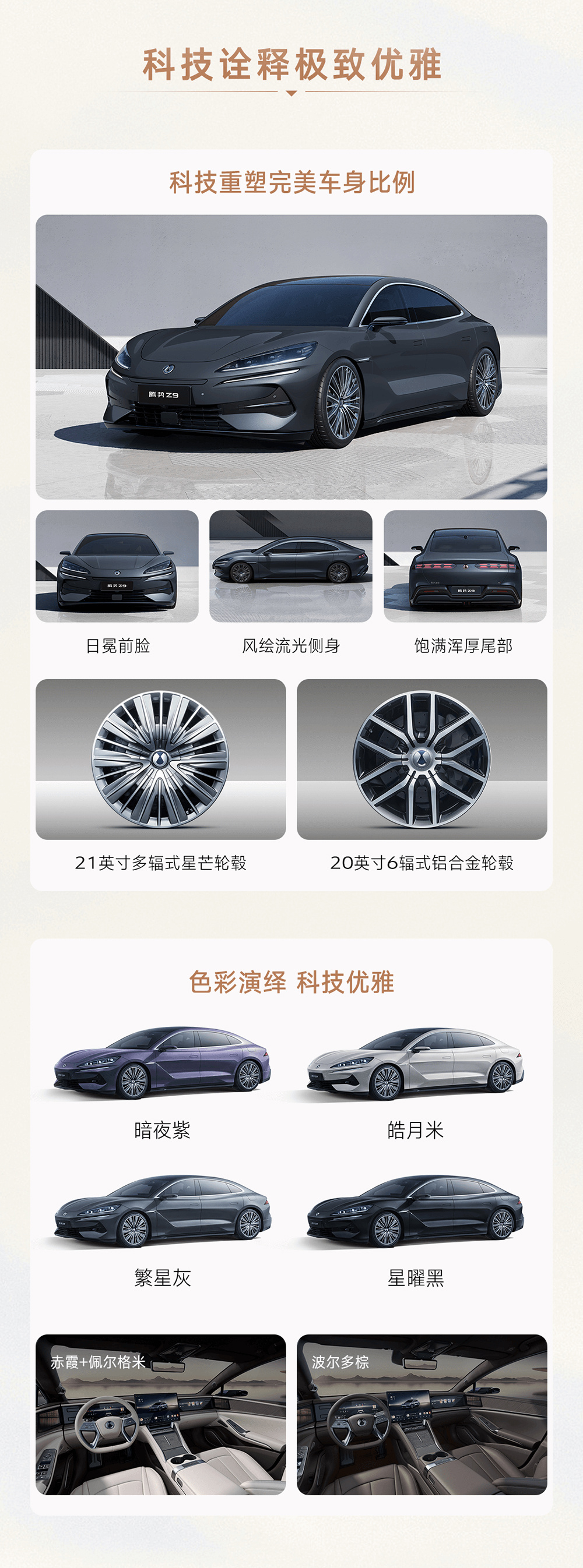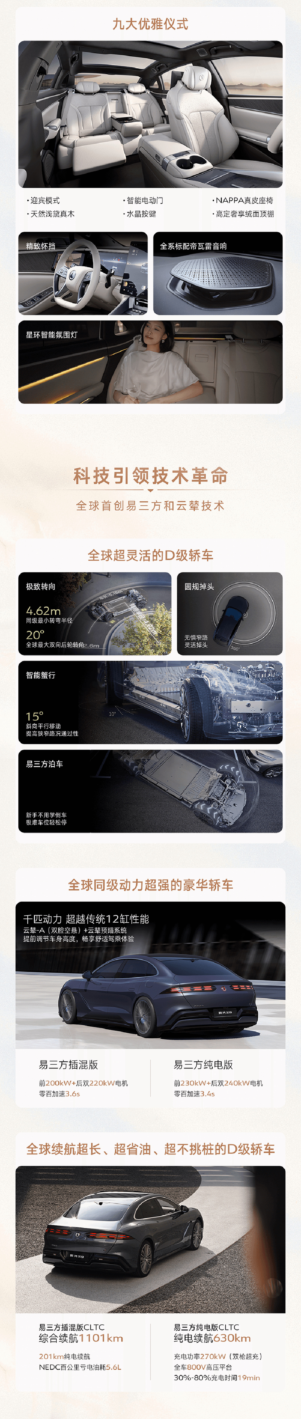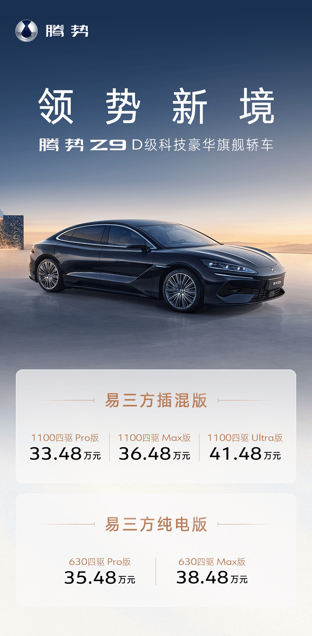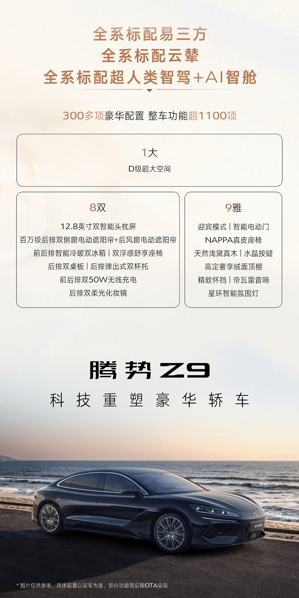 腾势 Z9 定位为 D 级智能豪华旗舰轿车,与 Z9 GT 形成“双旗舰”序列,提供纯电和插混两种动力,将全系标配易三方技术,还有云辇-A 智能空气车身控制系统,全系标配 10 个安全气囊,还有 4.62m 全球 D 级车最小转弯半径、15º 智能蟹行、全球首创的圆规掉头、车辆时速 140km/h 爆胎稳定控制等功能。