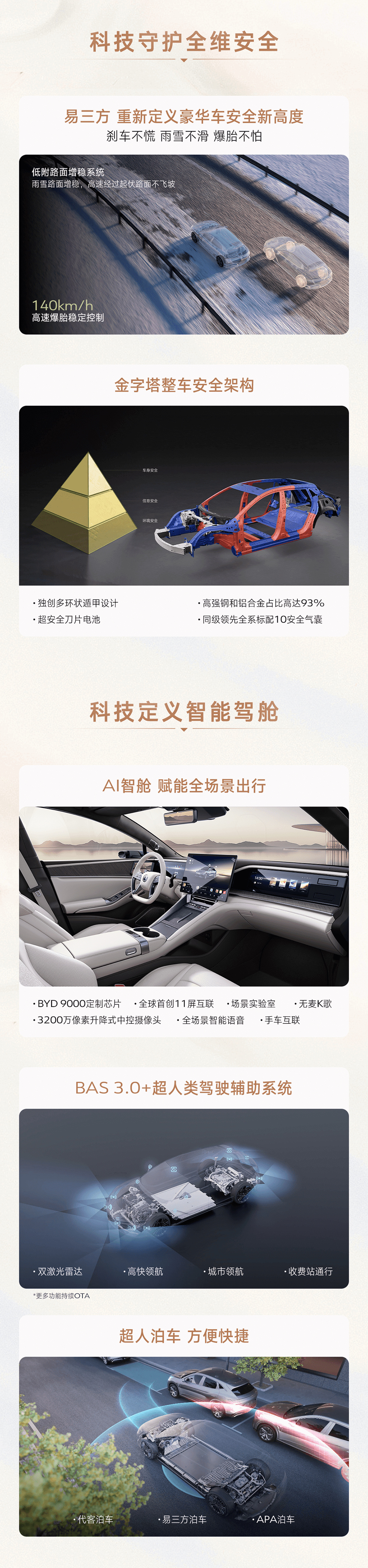 它还具备升降式中控摄像头,配备英伟达 Orin X 芯片、BAS 3.0+ “超人类驾驶辅助系统”,可以实现全国无图城市领航、自动泊车、代客泊车等等使用场景。