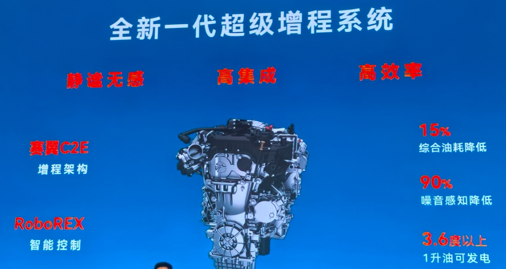 该系统采用赛翼 C2E 增程架构,号称综合油耗降低 15%,噪音感知降低 90%,1 升油可发电 3.6 度以上。