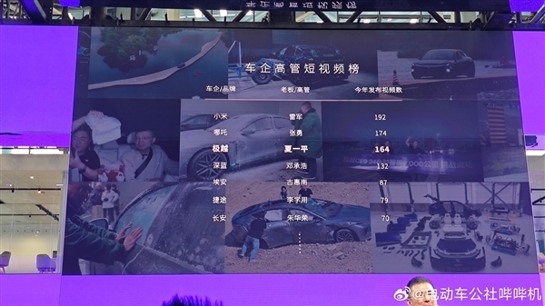 据汽车博主“电动车公社哔哔机 ”,在车展极越展台上,极越CEO夏一平公布了车企高管短视频榜。