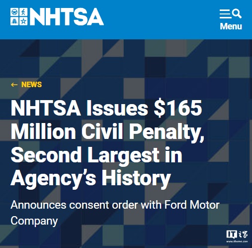 IT之家 11 月 15 日消息,据美国国家公路交通安全管理局官网 11 月 14 日消息,福特汽车同意支付 1.65 亿美元(IT之家备注:当前约 11.95 亿元人民币)罚款,原因是该公司未能遵守美国的召回要求。