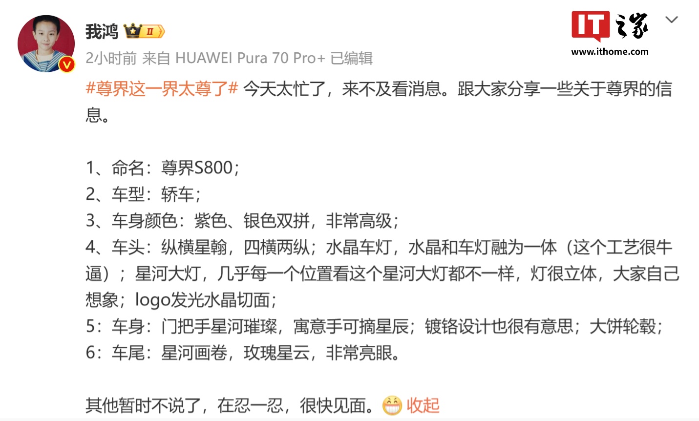 IT之家 11 月 15 日消息,博主 @我鸿 今晚透露,鸿蒙智行尊界轿车命名为“S800”: