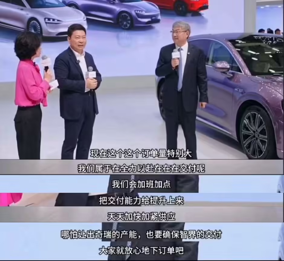 IT之家 11 月 16 日消息,在昨天开幕的广州车展上,奇瑞董事长尹同跃和华为常务董事、终端 BG 董事长、智能汽车解决方案 BU 董事长余承东共同参加鸿蒙智行的直播。
