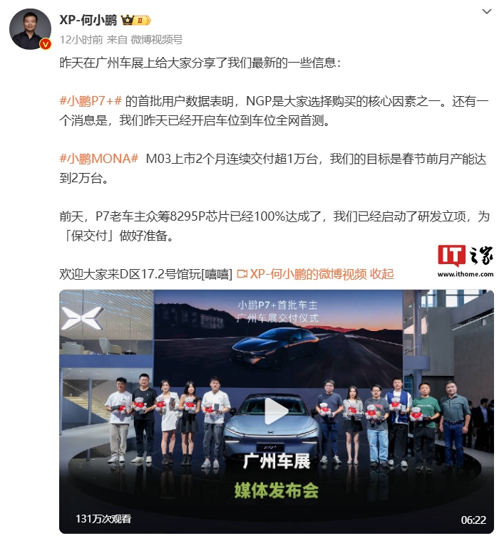 此外,小鹏 P7+ 汽车行业首个一套软件实现「车位到车位」已于 11 月 15 日开启全网首测。小鹏 P7 车型智能座舱芯片众筹已于 11 月 14 日达成,研发工作也已启动。