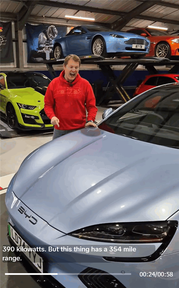 Shmee介绍,这台蓝色的比亚迪海豹是全轮驱动,拥有523Ps马力,续航354英里,零百加速3.8秒非常快,让他印象深刻。