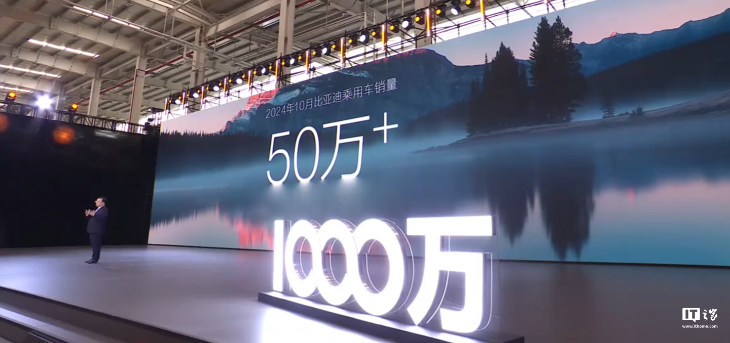 IT之家注意到,比亚迪汽车 10 月新能源汽车销量 502657 辆(首破 50 万辆),同比增长 66.53%;前 10 月新能源汽车销量 3,250,532 辆,同比增长 36.49%。