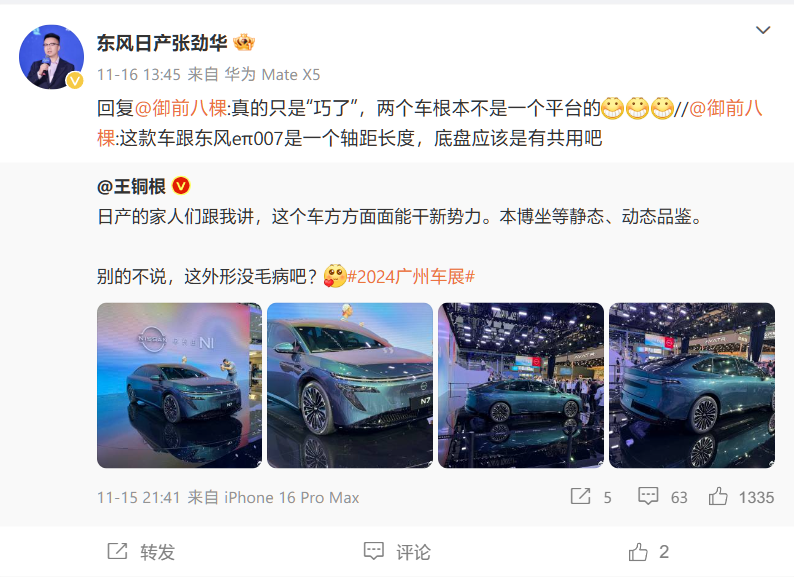 东风日产汽车销售有限公司用户运营中心部长张劲华针对此事回应称:真的只是“巧了”,两个车根本不是一个平台的。