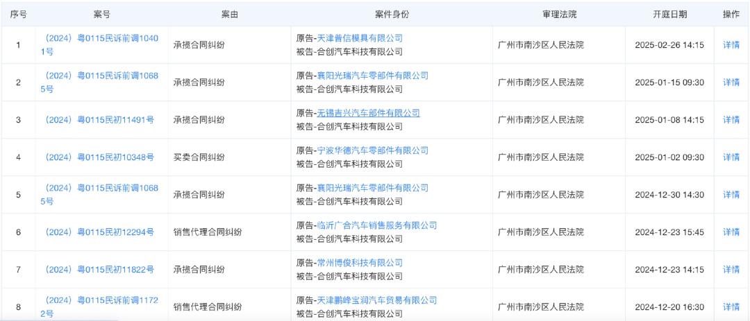 2024年,合创汽车作为被告的案件有百余起,官司已经排到了2025年的2月,已经有超过15家供应商和服务商就合同纠纷向广州市南沙区人民法院提起诉讼。