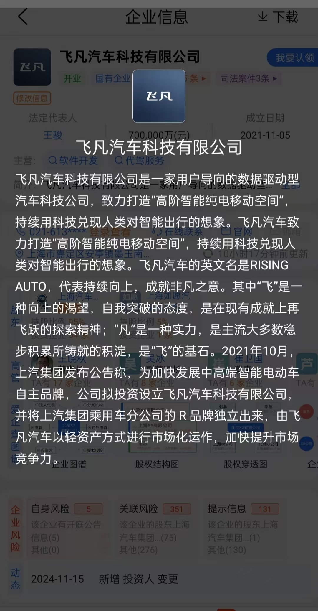 飞凡汽车科技有限公司成立于2021年11月,注册资本70亿元人民币,经营范围包括新能源汽车整车销售、新能源汽车换电设施销售、新能源汽车生产测试设备销售、集中式快速充电站等,现由上海汽车集团股份有限公司全资持股。