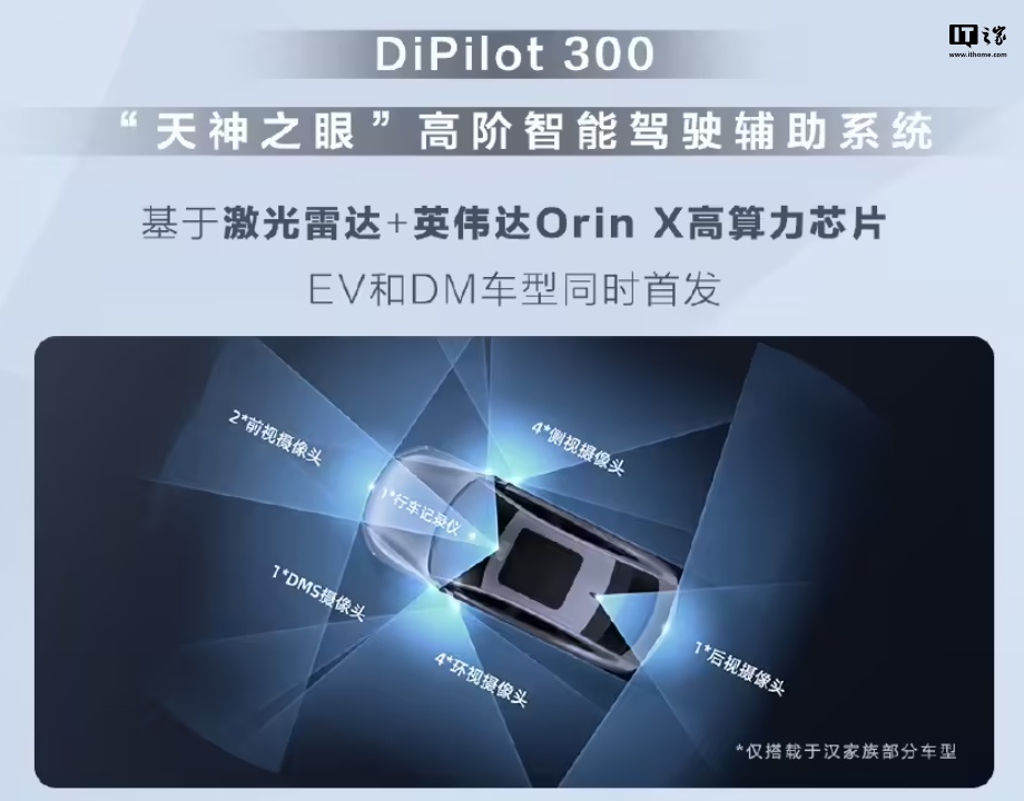 2025 款比亚迪汉纯电、混动的智驾版车型均配备激光雷达,以及 5 颗毫米波雷达、4 颗全景摄像头、7 颗智驾摄像头、英伟达 Orin-X 智驾芯片等硬件,搭载 DiPilot 300“天神之眼”高阶智能驾驶辅助系统,支持高快领航、城市领航、交通灯提醒等功能(IT之家注:部分功能需通过后期 OTA 升级实现)。