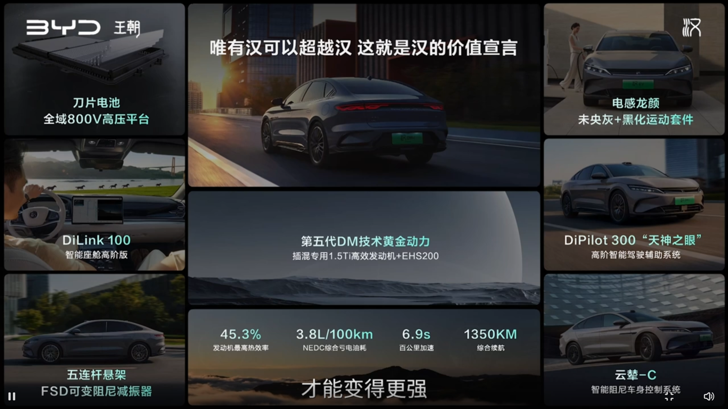 比亚迪 2025 款汉车型于 9 月 9 日上市。新车首次在 DM 和 EV 车型上采用了相同的前脸、新增“未央灰”车色、黑化运动套件,首搭“天神之眼” DiPilot 300 高阶智能驾驶辅助系统。