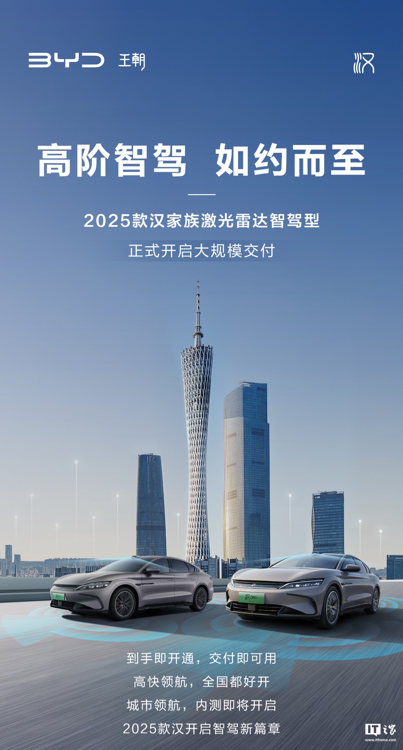 IT之家 11 月 19 日消息,比亚迪汽车今日官宣,2025 款汉家族激光雷达智驾型现已开启大规模交付,城市领航内测即将开启。