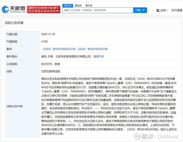 上述判决生效后,于某未履行致歉义务,北京车和家信息技术有限公司申请强制执行{案号:(2024)京0491执2563号}。现对上述判决主要内容予以公告。