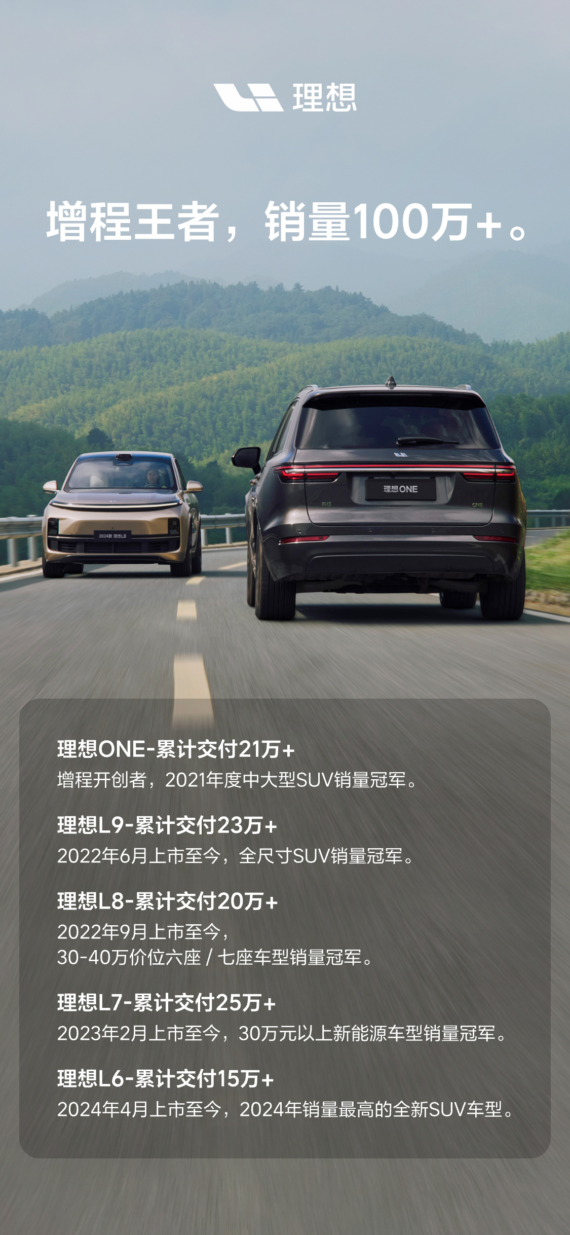 IT之家 11 月 19 日消息,理想汽车官方宣布,理想汽车销量突破一百万,其中理想 ONE 交付 21 万以上,理想 L9 交付 23 万以上,理想 L8 交付 20 万以上,理想 L7 交付 25 万以上,理想 L6 交付 15 万以上。