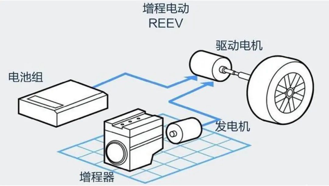 增程式混动是一种结构相对简单的串联驱动模式。在电池电量不足的情况下,增程动力车辆的增程器会通过发动机(增程器)烧油来发电,再由电机驱动车辆行驶。