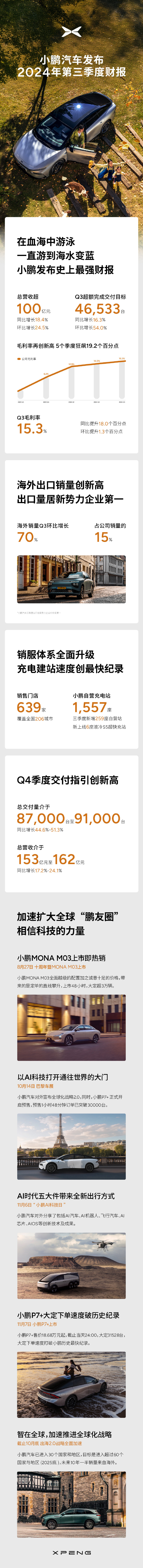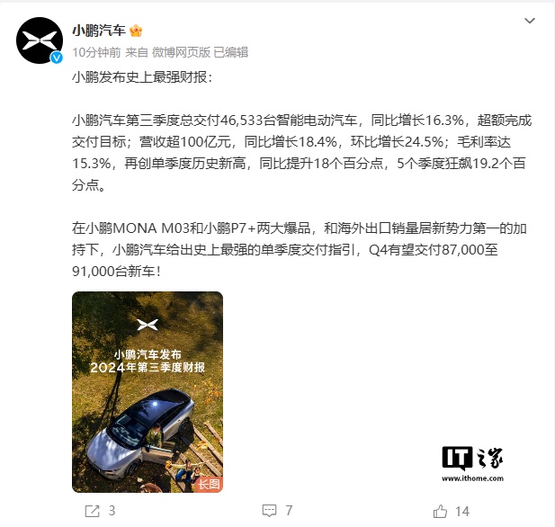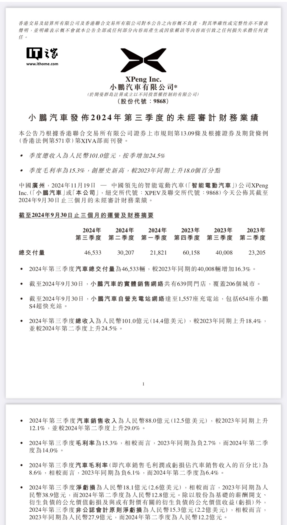 IT之家 11 月 19 日消息,小鹏汽车发布“史上最强财报”,2024 年第三季度总营收为人民币 101.0 亿元,较 2023 年同期上升 18.4%,并较 2024 年第二季度上升 24.5%;毛利率为 15.3%,创历史新高,相较而言,2023 年同期为负 2.7%,而 2024 年第二季度为 14.0%;净亏损为人民币 18.1 亿元,相较而言,2023 年同期为人民币 38.9 亿元,而 2024 年第二季度为人民币 12.8 亿元;小鹏汽车普通股股东应占净亏损为人民币 18.1 亿元,相较而言,2023 年同期为人民币 38.9 亿元,而 2024 年第二季度为人民币 12.8 亿元。