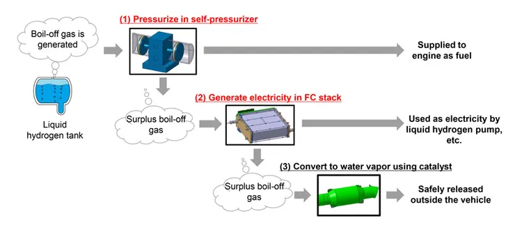2023 年,丰田在 GR Corolla H2 Concept 概念车中引入了一种液氢系统。该系统可在-253 摄氏度的低温下储存和加注液氢。由于氢气在室温下以气态存在,因此氢泵必须在低温下运行,以防止液氢沸腾。然而,该系统仍存在一定量的氢气沸腾逸散,无法有效利用。