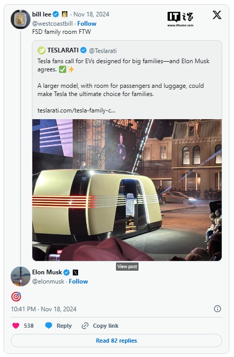 IT之家注意到,在今年 10 月的“We, Robot”活动上,特斯拉展示了 Robovan,这款尚未正式命名的车型更适合运动队、大型团体或货物运输,特斯拉粉丝仍期待一款适合大家庭的车型。