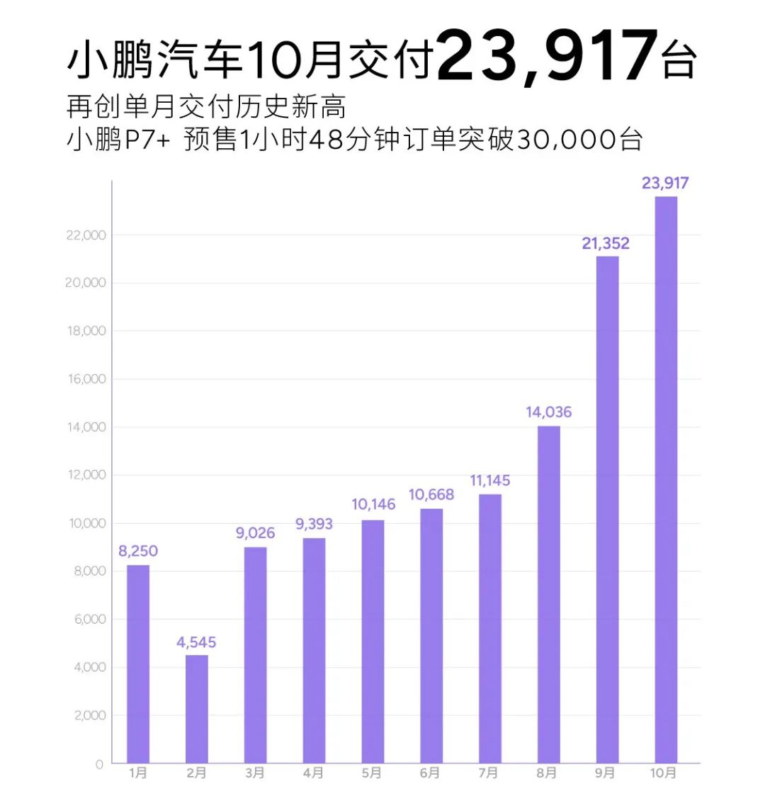 两款车型都实现了过去小鹏从未达到的热销。MONA M03 连续两个月交付破万,P7+ 上市 3 小时大定突破 3 万台,刷新小鹏汽车的销售记录。在此之前,小鹏已经连续 8 个月销量低迷,2 月份交付量一度降至 4,535 辆。MONA M03 上市以后,小鹏 9 月、10 月交付量接连破 2 万台。