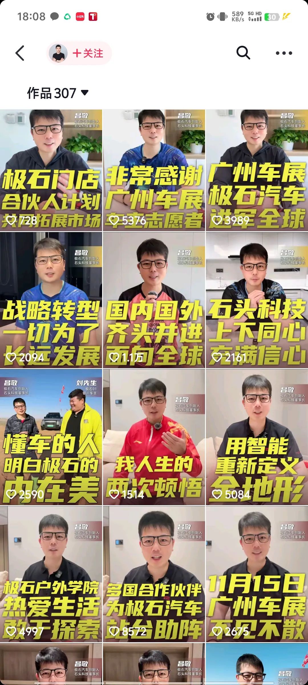 在抖音平台上,昌敬发布了许多作品,但内容大多与“极石汽车01”、“越野”等内容相关,石头科技的扫地机器人相关内容寥寥无几。