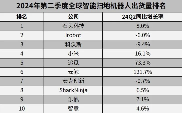 石头科技自独立以来,一直牢牢的占据着国内市场前三甲的位置;2023年,成功超过科沃斯成为全国第一;2024年二季度,超过iRobot,销量跃居全球第一。