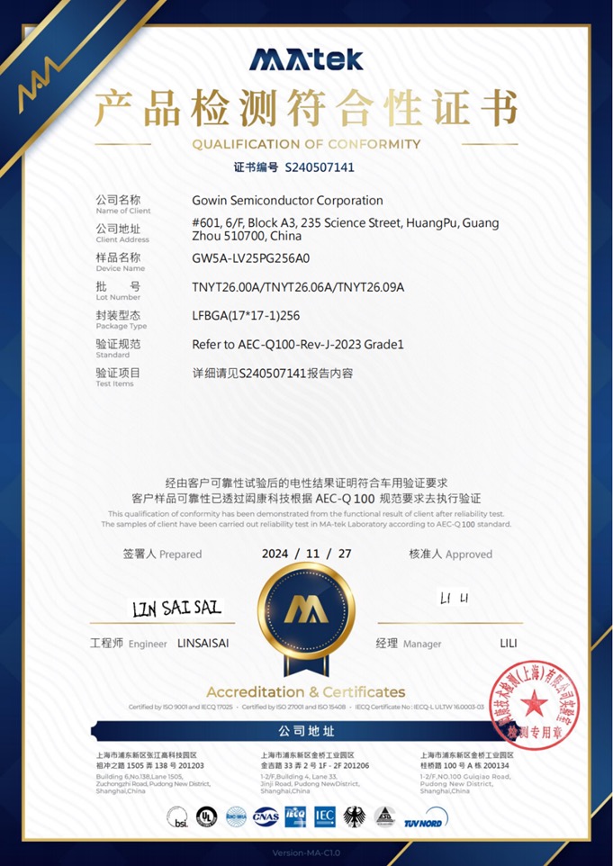 高云半导体所获AEC-Q100(Grade1)认证证书