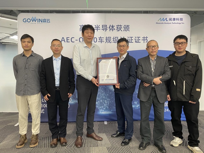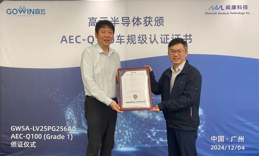 2024年12月4日,全球领先的分析检测机构闳康科技为高云半导体颁发 AEC-Q100 认证通过证书。高云半导体董事长王博钊,闳康科技中华区总经理徐瑞祥等双方代表出席了此次颁证仪式。