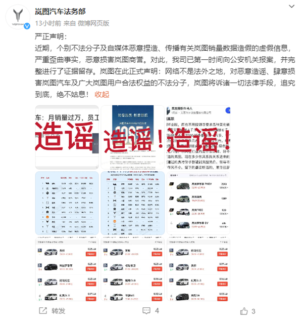 岚图在此正式声明:网络不是法外之地,对恶意造谣、肆意损害岚图汽车及广大岚图用户合法权益的不法分子,岚图将诉诸一切法律手段,追究到底,绝不姑息!