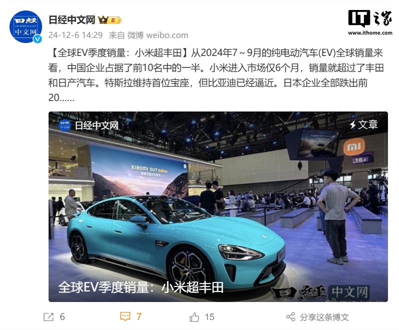 IT之家 12 月 7 日消息,据日本经济新闻 6 日报道,调查公司 MarkLines 统计了纯电动汽车销量。对象为 2024 年 7~9 月在全球 55 个国家销售的 250 万辆以上的纯电动汽车。