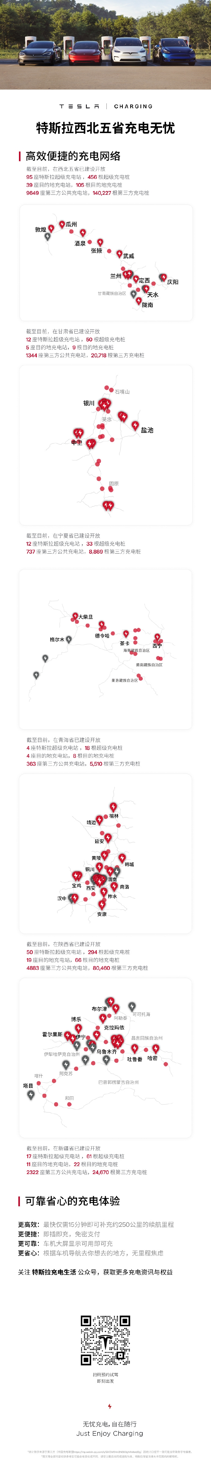 特斯拉近日宣布,截至当前,已在中国的西北五省——甘肃、宁夏、青海、陕西和新疆——成功部署并开放了456根超级充电桩以及105根目的地充电桩。这一举措极大地提升了电动车主在这些地区的充电便利性。除此之外,在上述区域内,还提供了多达140,227根第三方充电桩供用户选择使用。