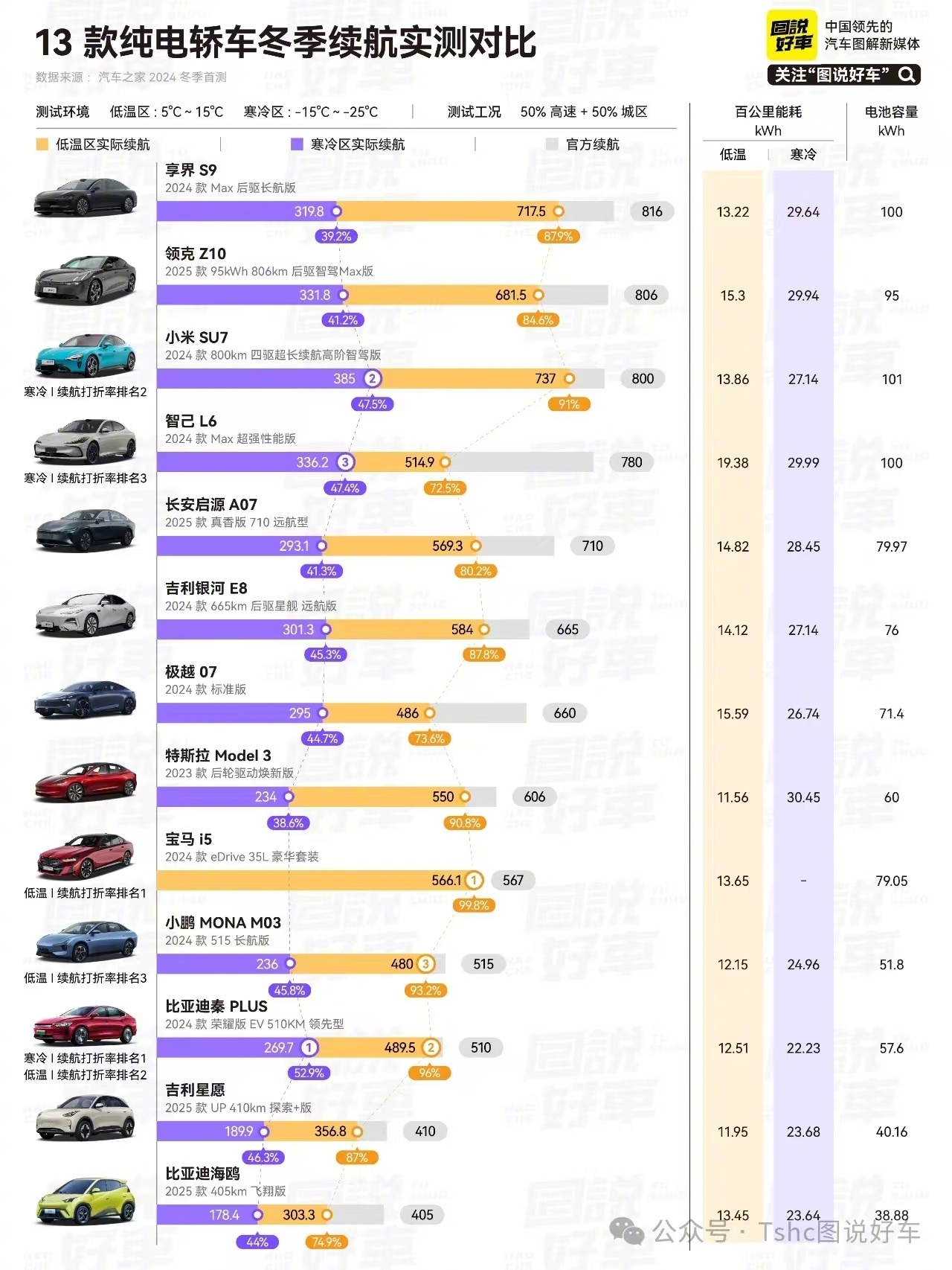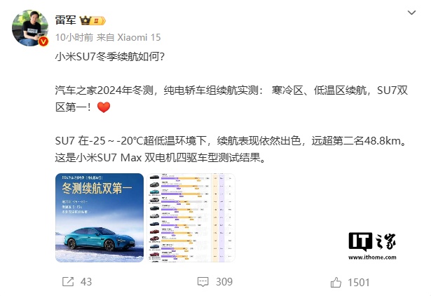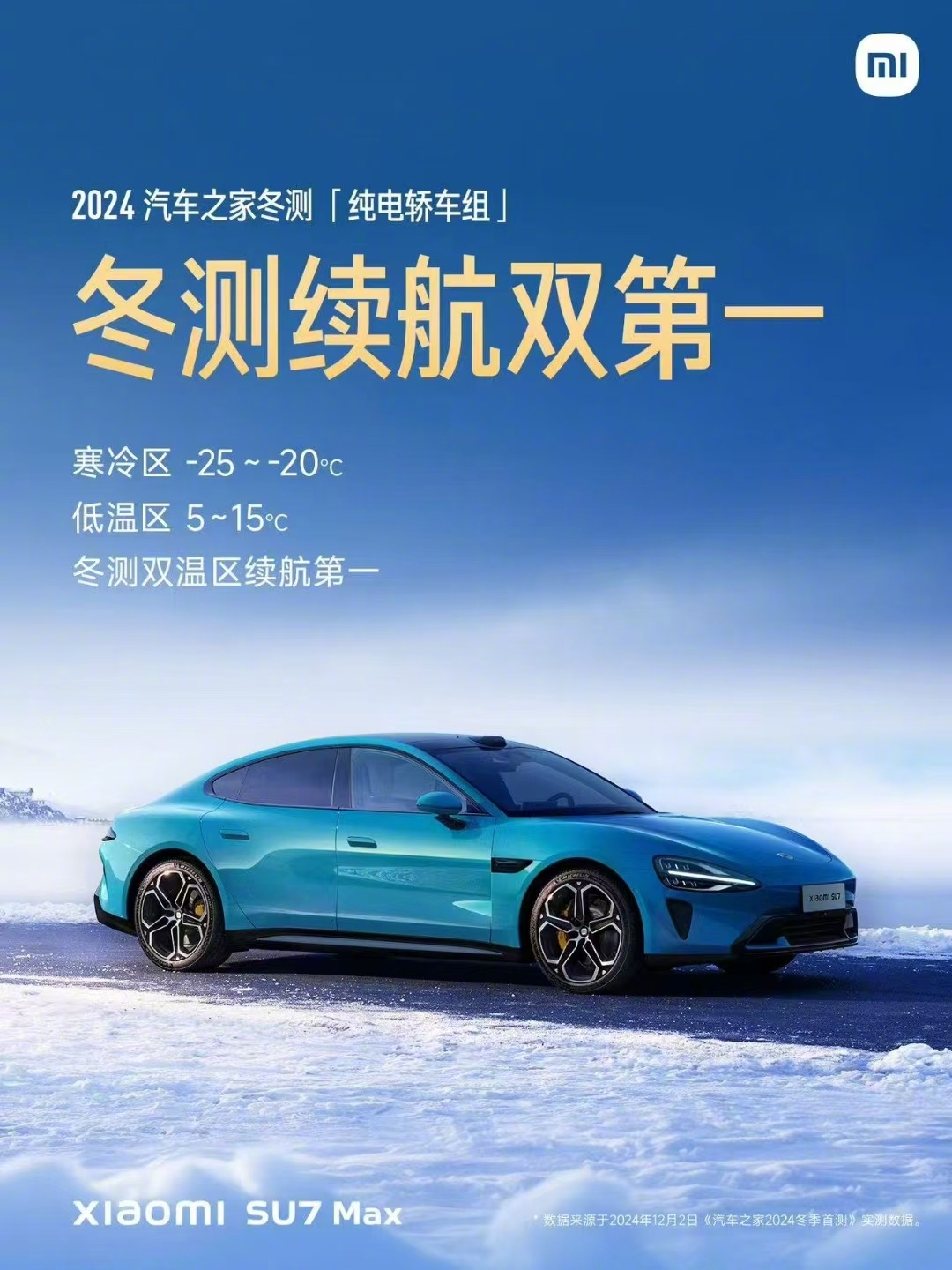 IT之家 12 月 8 日消息,小米创办人、董事长兼 CEO 雷军昨晚发微博称,在汽车之家 2024 年冬测的纯电轿车组续航实测中,小米 SU7 取得了寒冷区、低温区续航双区第一。