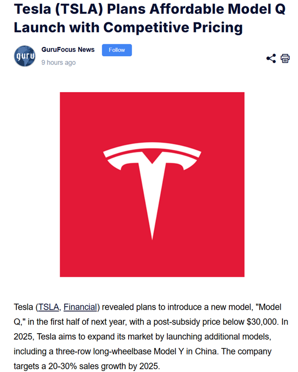 据报道,日前,在德银举办的特斯拉投资者关系负责人Travis Axelrod的投资者会议上,特斯拉方面表示,计划在明年上半年推出名为“Model Q”的新车型,补贴后价格低于30,000美元。