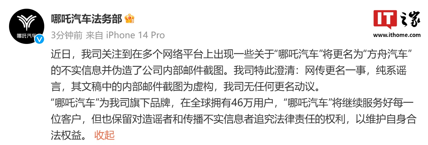 IT之家 12 月 8 日消息,哪吒汽车法务部今日发文,称网传更名一事,纯系谣言,其文稿中的内部邮件截图为虚构,无任何更名动议。