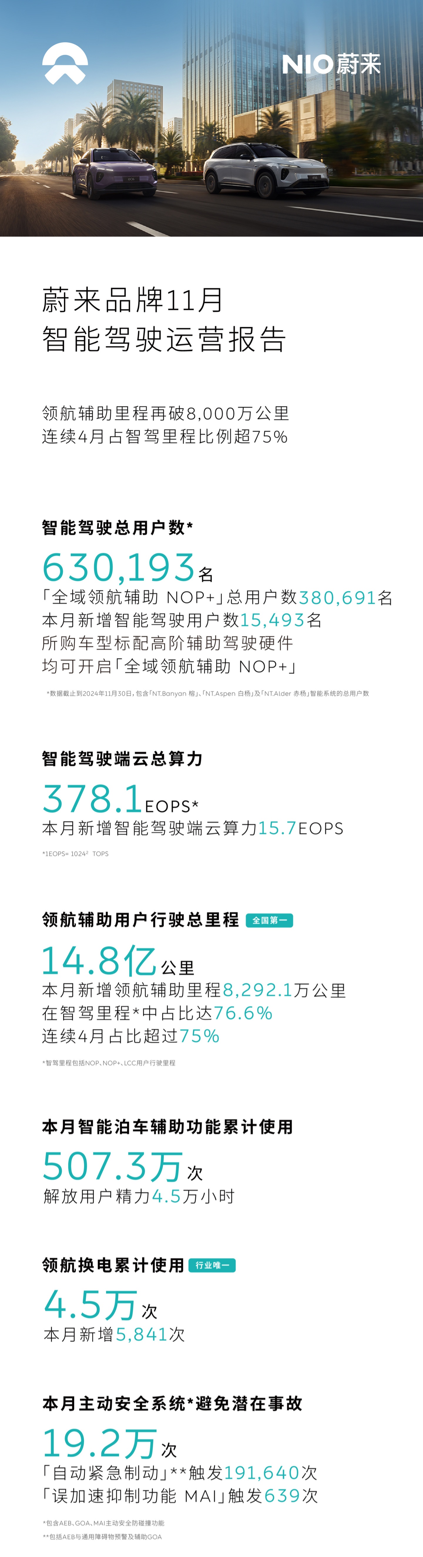 另外,蔚来昨日还发布了 11 月智能驾驶运营报告,数据显示蔚来品牌汽车领航辅助里程再破 8000 万公里,占智驾里程比例连续 4 月突破 75%。