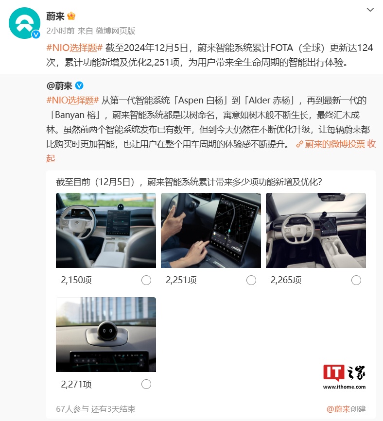 IT之家 12 月 8 日消息,蔚来官方今日公布数据:截至 2024 年 12 月 5 日,蔚来智能系统累计 FOTA(全球)更新达 124 次,累计功能新增及优化 2251 项。