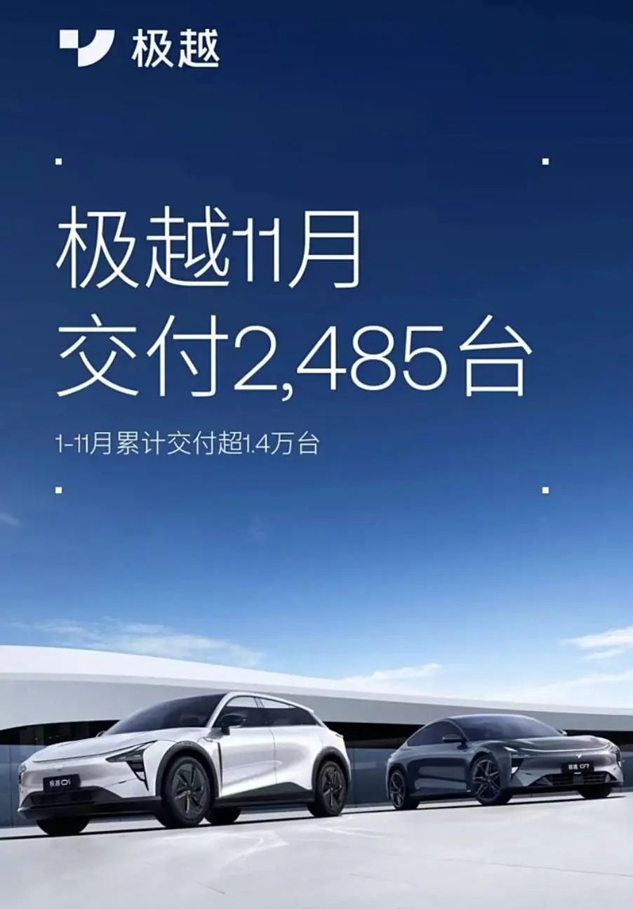 极越公布11月交付数据,共计交付新车2485台,1-11月累计交付超过1.4万台。