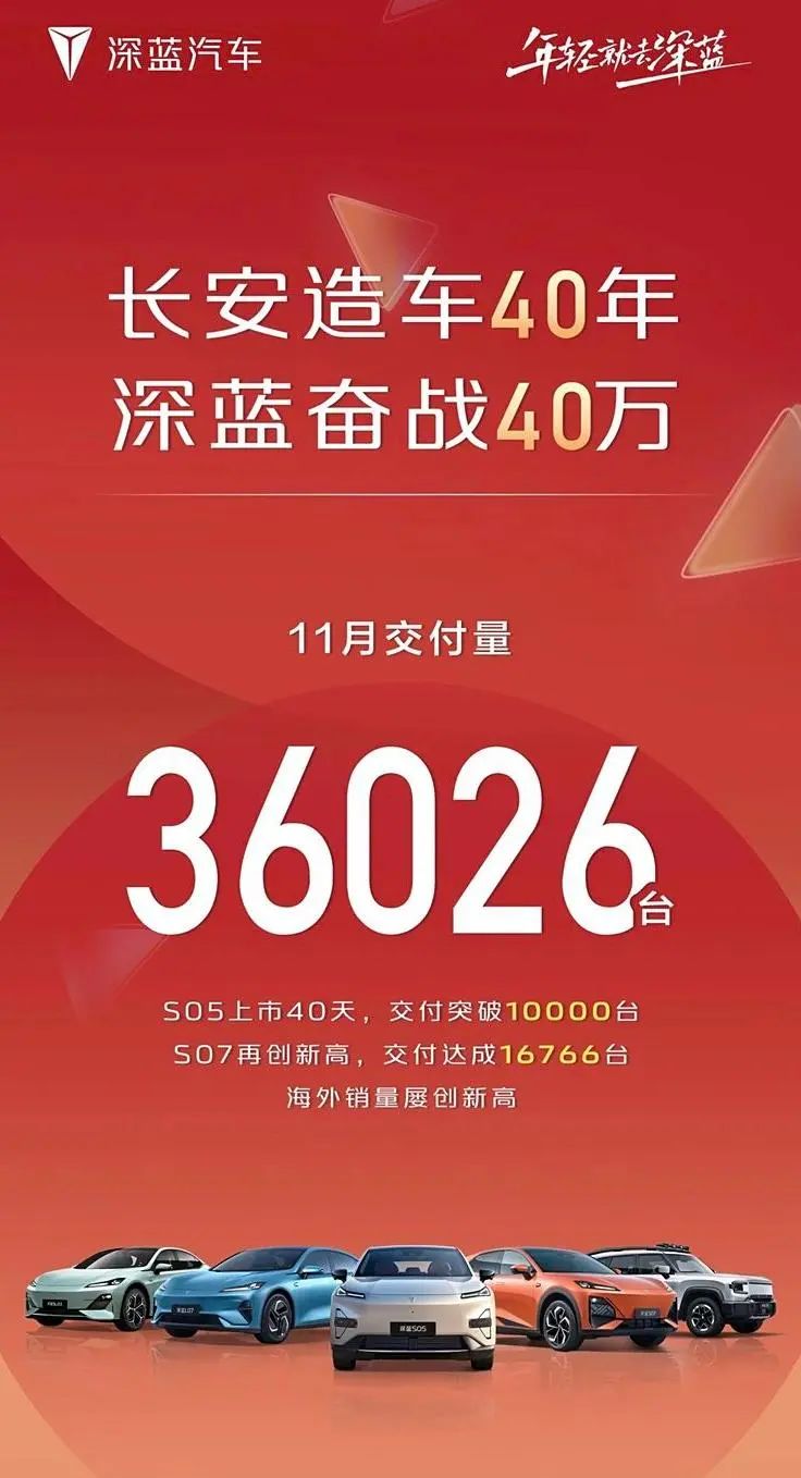 深蓝汽车公布11月交付数据,共交付新车36026台,其中S05上市40天交付突破1万台,S07交付16766台。