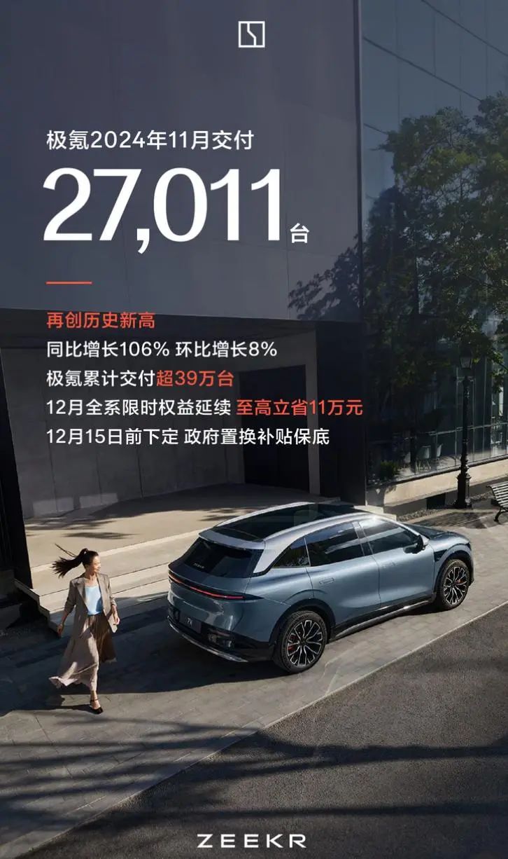 极氪汽车公布11月交付数据,共计交付新车27011台,同比增长106%,环比增长8%,极氪累计交付超39万台。
